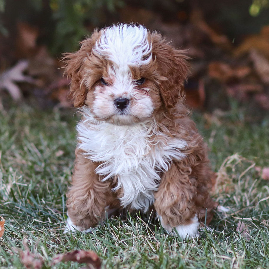 Bruno is a richly colored apricot Cavapoo boy with a full, fluffy coat and an adorable round expression. He’s one of the deeper-shaded puppies in the litter, giving him that warm, striking Cavapoo coloring that stands out beautifully.